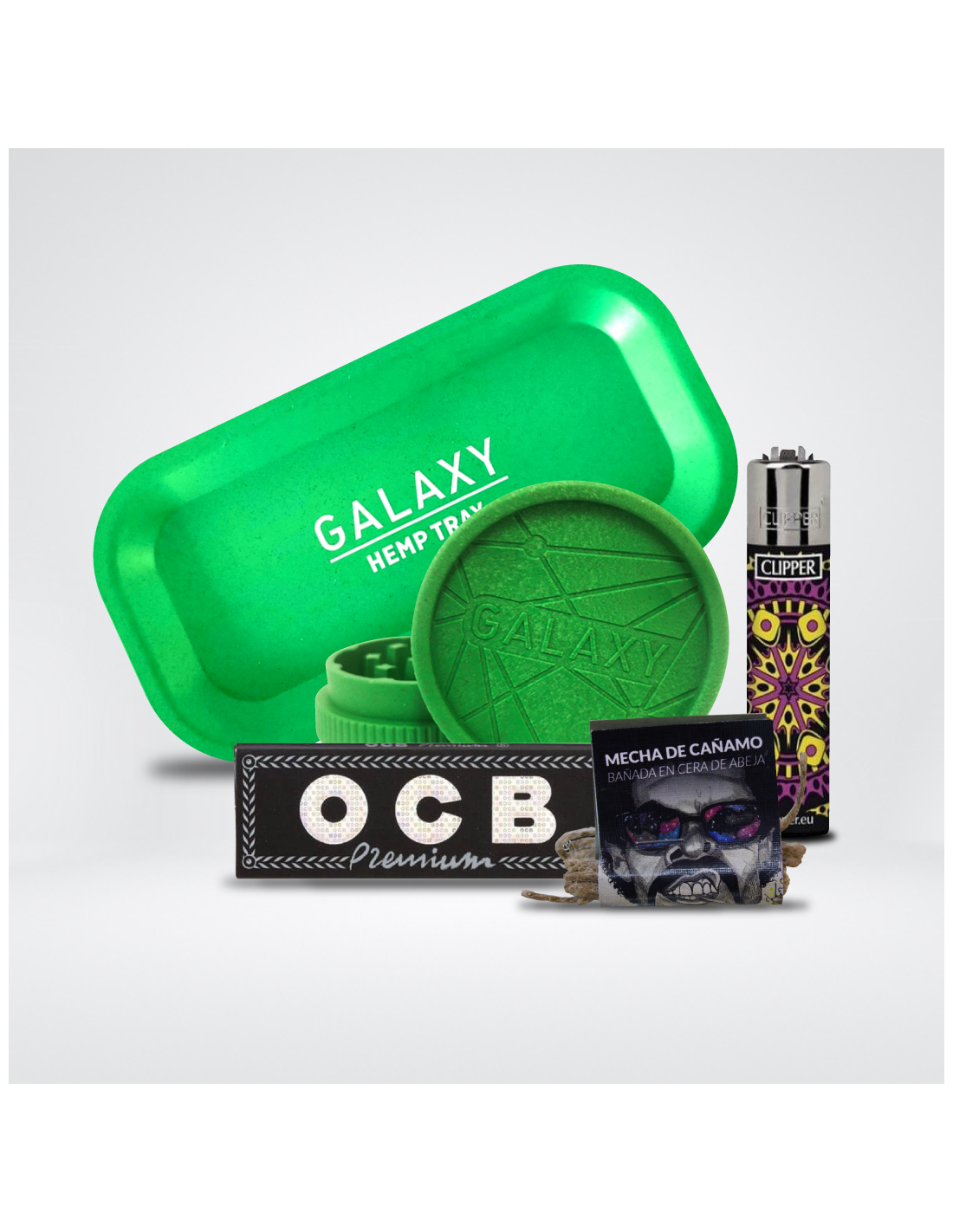 Descubre la combinación perfecta de estilo, funcionalidad y calidad con nuestro pack del Galaxy EcoHemp. En él encontrará al moledor EcoHemp de Galaxy realizado con materiales recicables, la práctica bandeja de enrolar y los accesorios premium como el papel OCB el encendedor Clipper. Completa tu experiencia con la mecha de cáñamo Astro, y sumérgete en un mundo de sofisticación y placer natural.