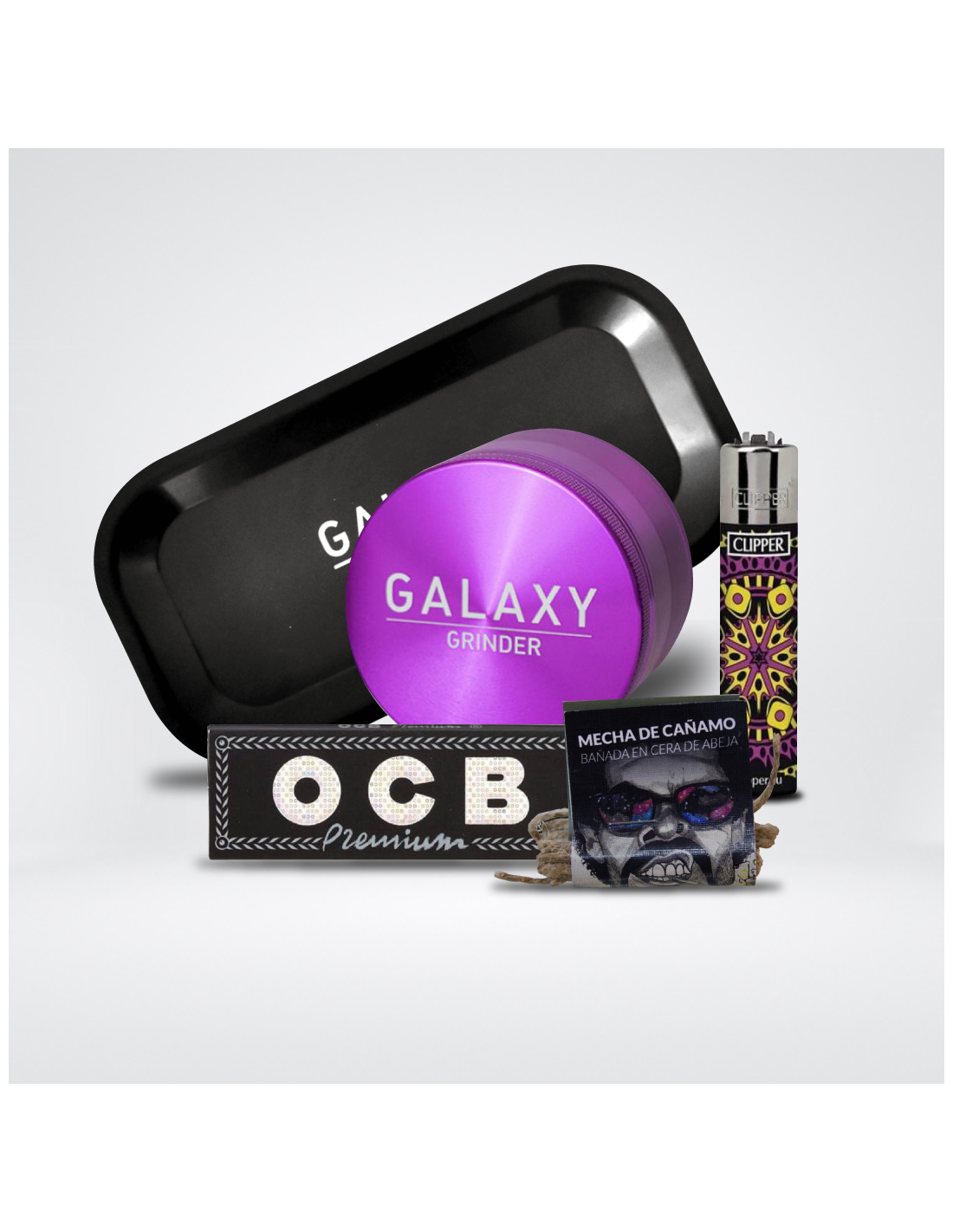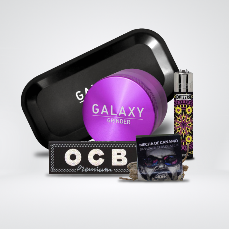 Eleva tu ritual de cannabis con este exclusivo pack, diseñado meticulosamente para los aficionados que valoran la calidad y la comodidad. Este conjunto integral transforma cada sesión en una experiencia sofisticada y placentera, destacando por su funcionalidad y estilo. El corazón del pack es el Galaxy Grinder de 55 mm, una obra maestra en diferentes colores que garantiza una molida perfecta de tus cogollos, preservando su frescura y potenciando su aroma. Acompañándolo, la bandeja de enrolado de hemp Galaxy que no solo es práctica sino también un accesorio distintivo que refleja tu pasión por el universo del cannabis.