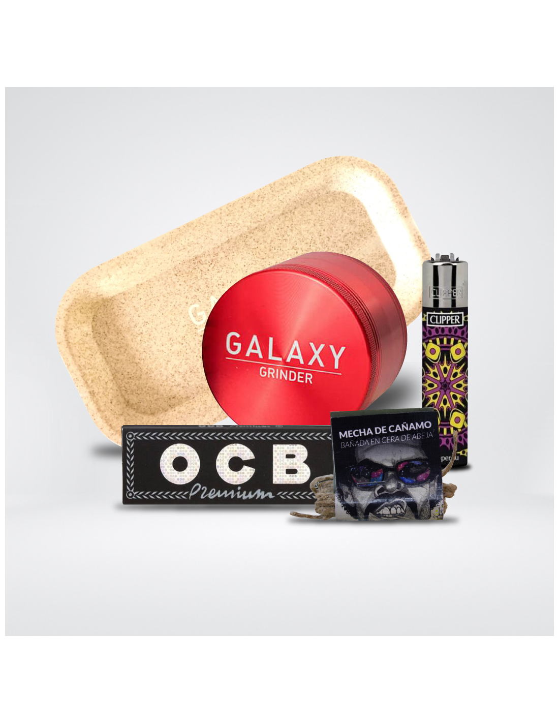 Eleva tu ritual de cannabis con este exclusivo pack, diseñado meticulosamente para los aficionados que valoran la calidad y la comodidad. Este conjunto integral transforma cada sesión en una experiencia sofisticada y placentera, destacando por su funcionalidad y estilo. El corazón del pack es el Galaxy Grinder de 55 mm, una obra maestra en diferentes colores que garantiza una molida perfecta de tus cogollos, preservando su frescura y potenciando su aroma. Acompañándolo, la bandeja de enrolado de hemp Galaxy que no solo es práctica sino también un accesorio distintivo que refleja tu pasión por el universo del cannabis.