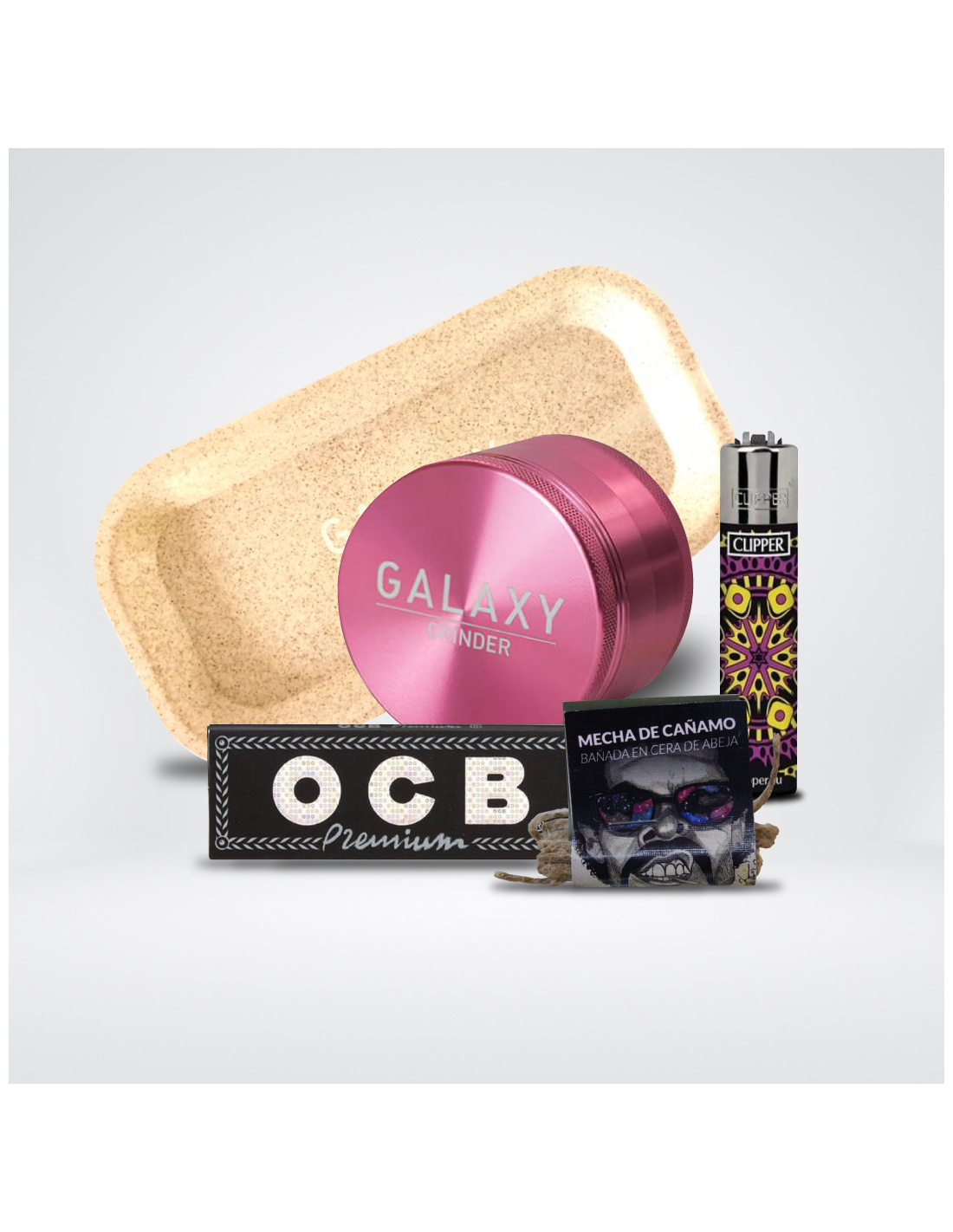 Eleva tu ritual de cannabis con este exclusivo pack, diseñado meticulosamente para los aficionados que valoran la calidad y la comodidad. Este conjunto integral transforma cada sesión en una experiencia sofisticada y placentera, destacando por su funcionalidad y estilo. El corazón del pack es el Galaxy Grinder de 55 mm, una obra maestra en diferentes colores que garantiza una molida perfecta de tus cogollos, preservando su frescura y potenciando su aroma. Acompañándolo, la bandeja de enrolado de hemp Galaxy que no solo es práctica sino también un accesorio distintivo que refleja tu pasión por el universo del cannabis.