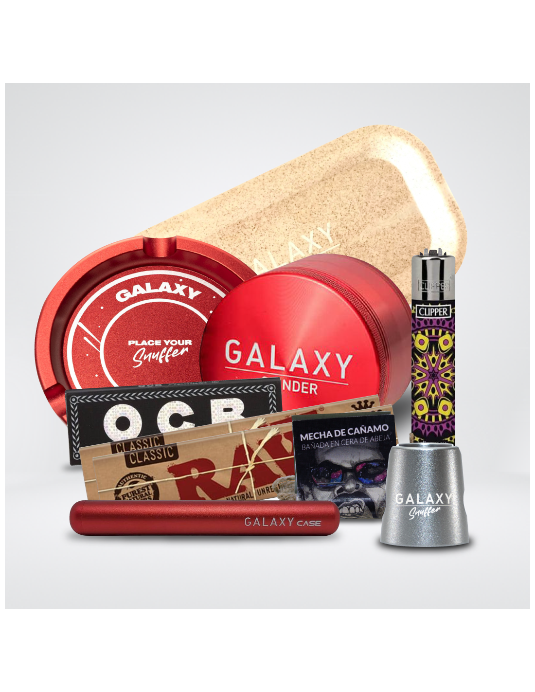 Nuestro pack premium ofrece todo lo necesario para una experiencia de cannabis inolvidable. Con el Galaxy Grinder de 63mm, la bandeja de enrolado Galaxy Grinder, preparar tus porros nunca fue tan elegante. Los papelillos RAW Classic, los papeles negros de OCB y el encendedor Clipper podrás elevar cada sesión, mientras que la mecha de cáñamo Astro añade un toque ecológico. Como si esto no fuera suficiente, el Galaxy Case, Galaxy Snuffer y Galaxy Stardust completan el conjunto, asegurando que tus accesorios estén siempre protegidos. Descubre la combinación perfecta de estilo, funcionalidad y calidad con nuestro pack.