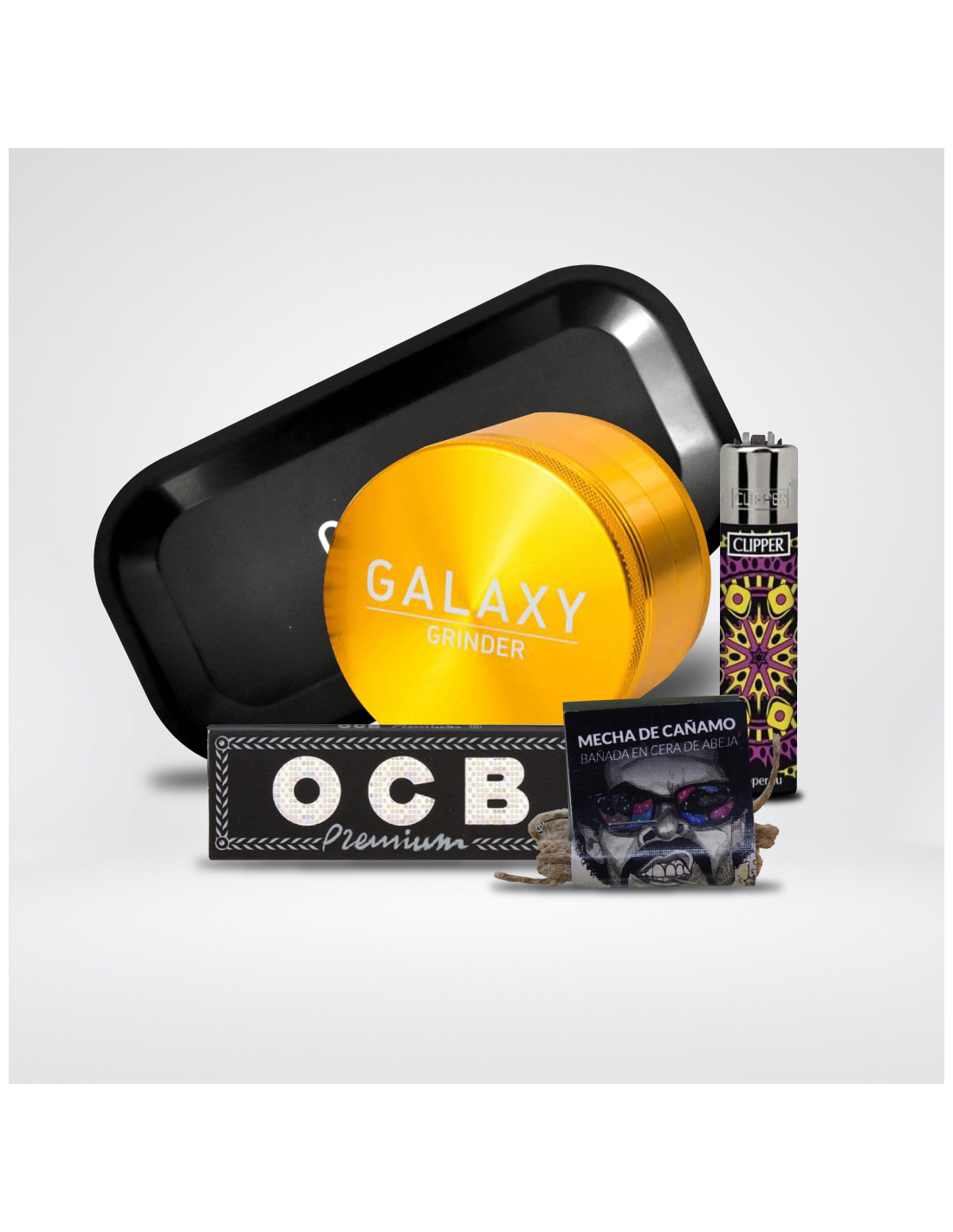 Eleva tu ritual de cannabis con este exclusivo pack, diseñado meticulosamente para los aficionados que valoran la calidad y la comodidad. Este conjunto integral transforma cada sesión en una experiencia sofisticada y placentera, destacando por su funcionalidad y estilo. El corazón del pack es el Galaxy Grinder de 63 mm, una obra maestra en diferentes colores que garantiza una molida perfecta de tus cogollos, preservando su frescura y potenciando su aroma. Acompañándolo, la bandeja de enrolado de hemp Galaxy que no solo es práctica sino también un accesorio distintivo que refleja tu pasión por el universo del cannabis.