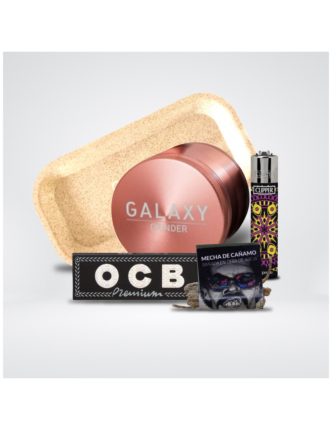 Eleva tu ritual de cannabis con este exclusivo pack, diseñado meticulosamente para los aficionados que valoran la calidad y la comodidad. Este conjunto integral transforma cada sesión en una experiencia sofisticada y placentera, destacando por su funcionalidad y estilo. El corazón del pack es el Galaxy Grinder de 63 mm, una obra maestra en diferentes colores que garantiza una molida perfecta de tus cogollos, preservando su frescura y potenciando su aroma. Acompañándolo, la bandeja de enrolado de hemp Galaxy que no solo es práctica sino también un accesorio distintivo que refleja tu pasión por el universo del cannabis.