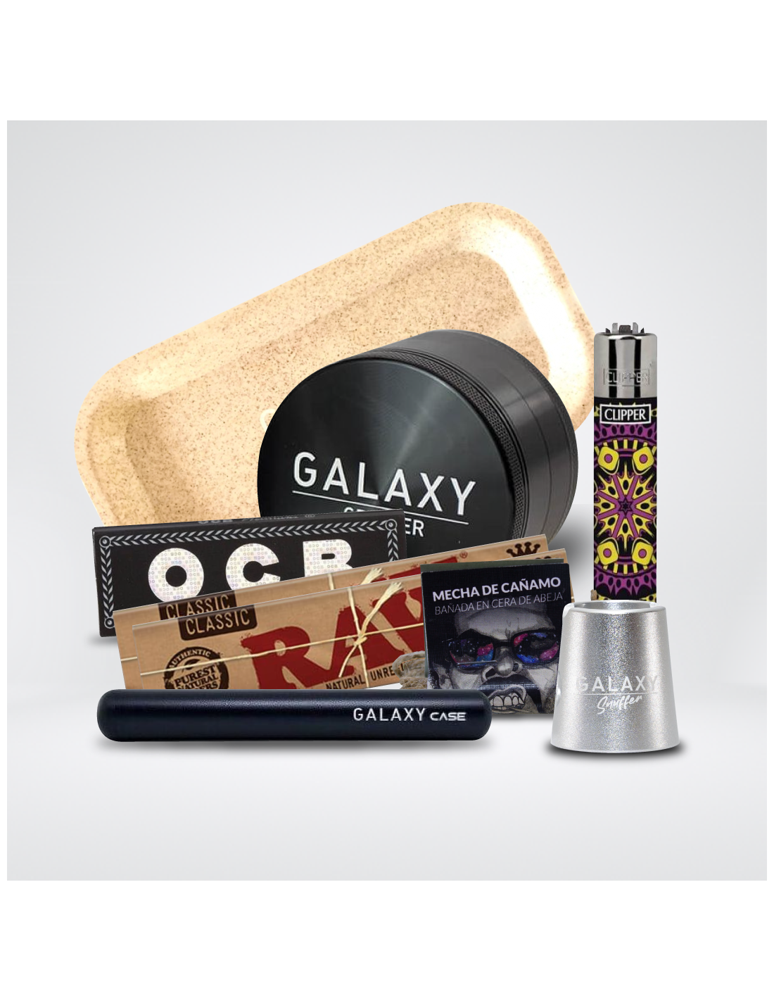 Acompañando al grinder, encuentra una serie de accesorios Galaxy tales como la bandeja de enrolar Hemp para armar tus porros, un Galaxy Case ideal para mantener a salvo tus joints y un Galaxy Snuffer para apagar tus porros de manera efectiva y segura. Enciende tus creaciones con el encendedor Clipper incluido, que no solo ofrece una variedad de diseños para reflejar tu estilo, sino que también es recargable.