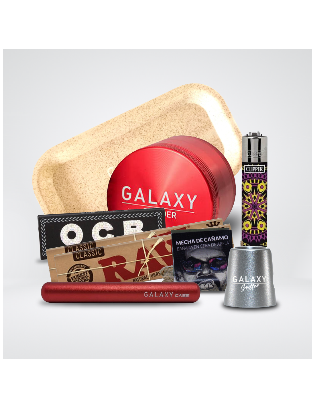 Acompañando al grinder, encuentra una serie de accesorios Galaxy tales como la bandeja de enrolar Hemp para armar tus porros, un Galaxy Case ideal para mantener a salvo tus joints y un Galaxy Snuffer para apagar tus porros de manera efectiva y segura. Enciende tus creaciones con el encendedor Clipper incluido, que no solo ofrece una variedad de diseños para reflejar tu estilo, sino que también es recargable.
