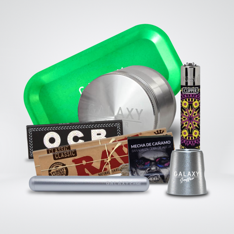 Eleva tu experiencia de cannabis con nuestro pack completo, ideal para los verdaderos aficionados. Consta del eficiente Galaxy Grinder de 63 mm, bandeja de enrolar Galaxy, Galaxy Case y Snuffer, encendedor Clipper multifuncional, papelillos RAW y OCB para fumadas puras, mecha de cáñamo Astro para sesiones continuas. Un kit esencial para disfrutar con estilo, comodidad y calidad.