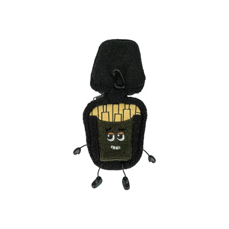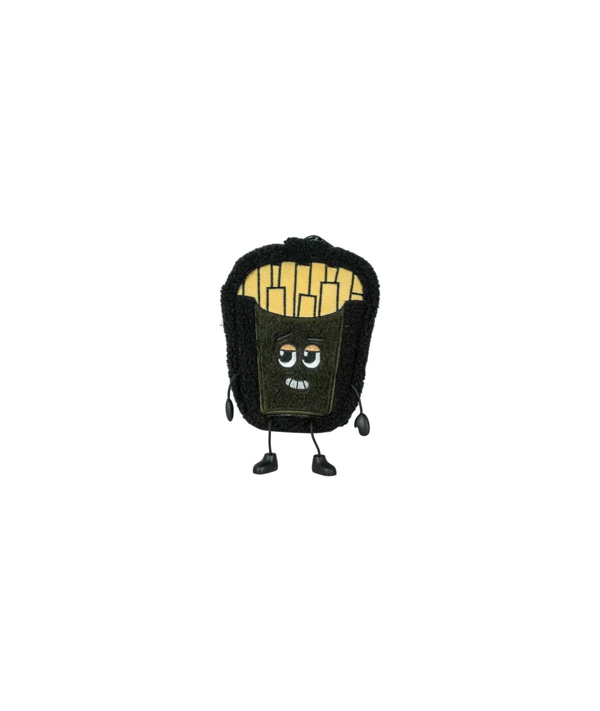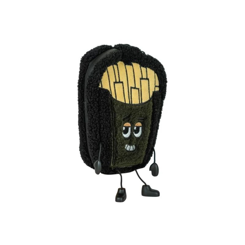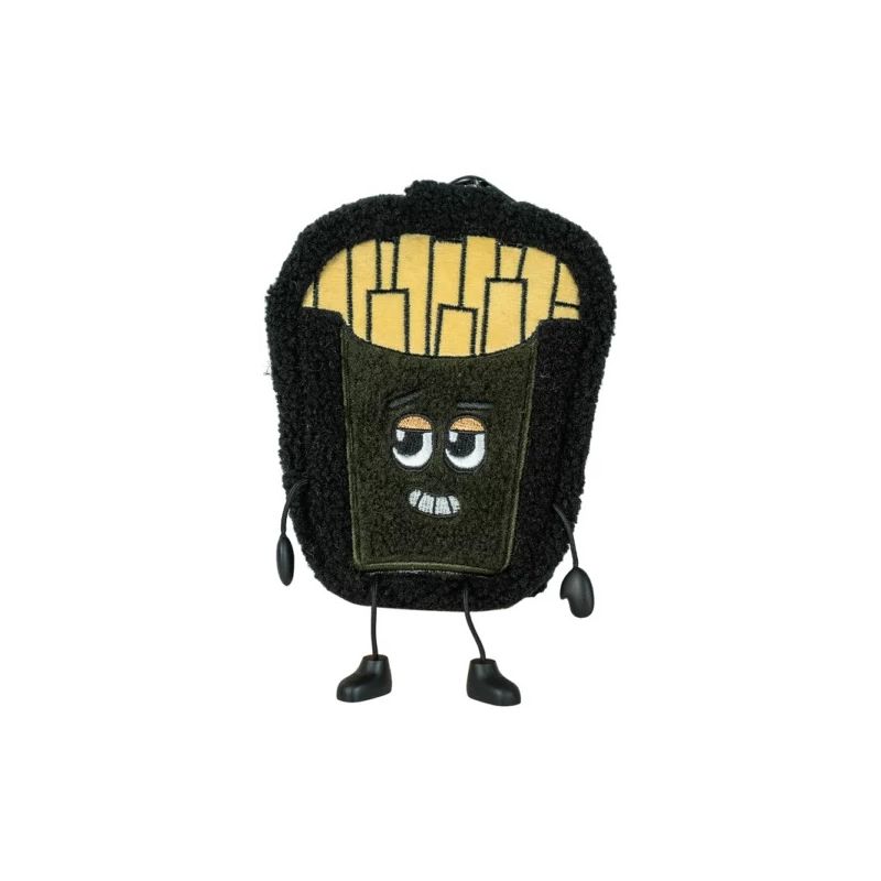 Bolso compacto tipo peluche con diseño de papa frita, tecnología CDO para control de olores y kit completo para fumadores.