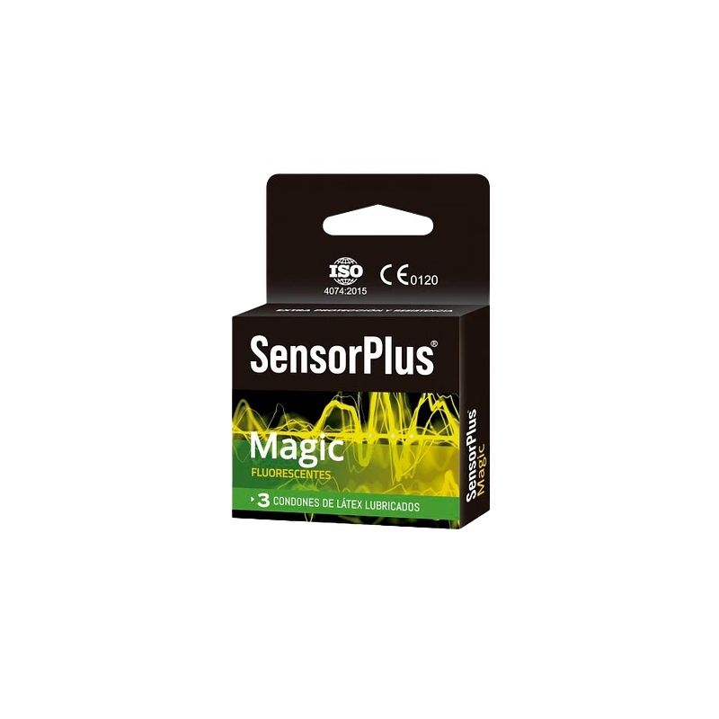 Preservativo Sensor Plus Magic Fluorescente Protección con color y seguridad. Condones de látex lubricados con efecto brillante bajo luz. Caja de 3 unidades.