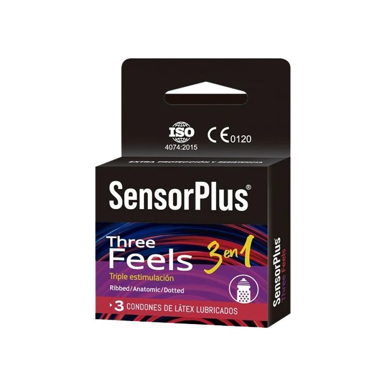 -El preservativo Sensor Plus Three Feels está diseñado para quienes buscan una experiencia de mayor estimulación sin comprometer la seguridad. Este modelo combina tres características en un solo condón: superficie estriada (ribbed), textura con puntos (doted) y forma anatómica que se ajusta perfectamente para mayor comodidad.
