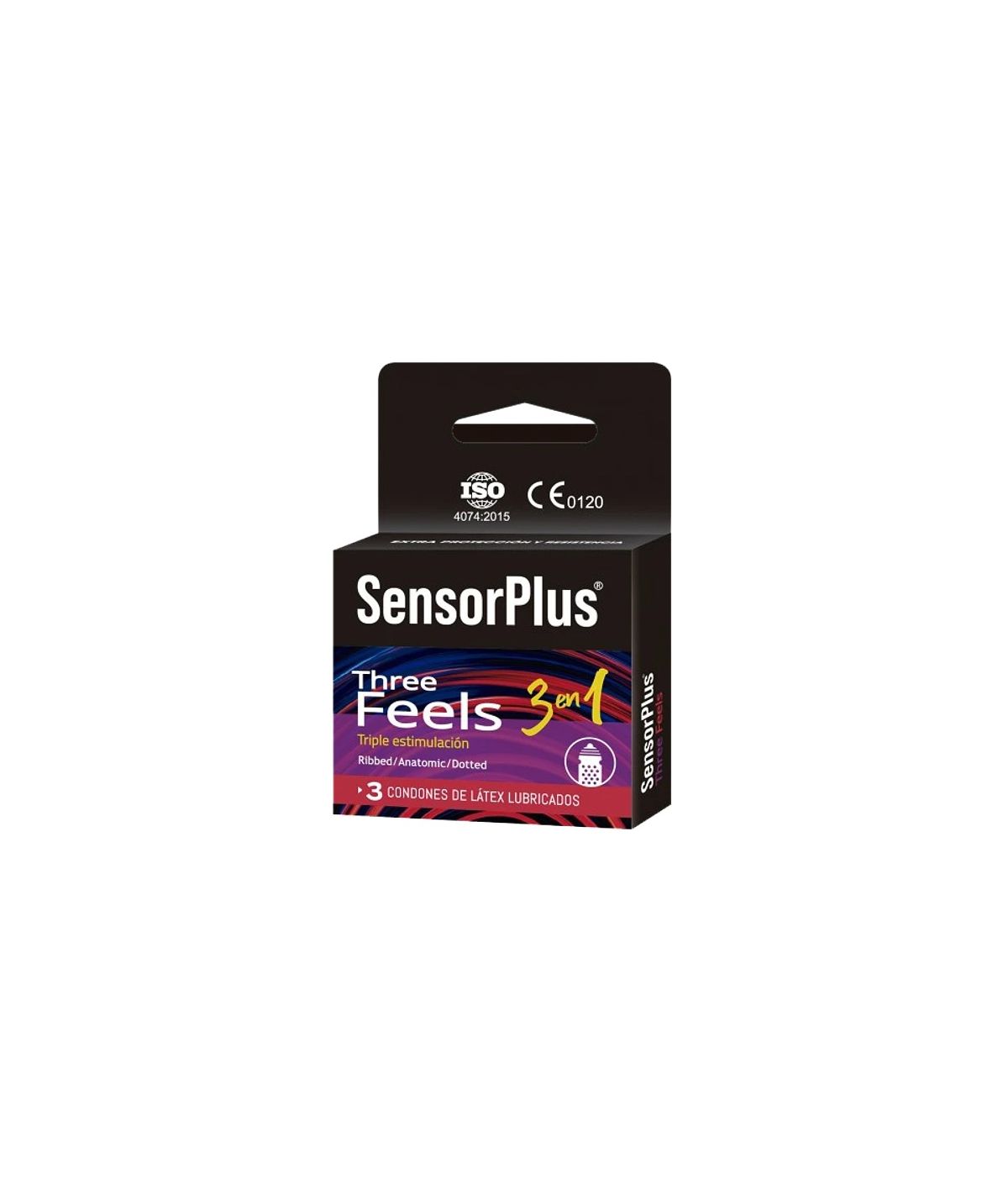 Preservativo Sensor Plus Three Feels Triple sensación en un solo condón. Textura estriada, puntos estimulantes y diseño anatómico para mayor placer y protección.