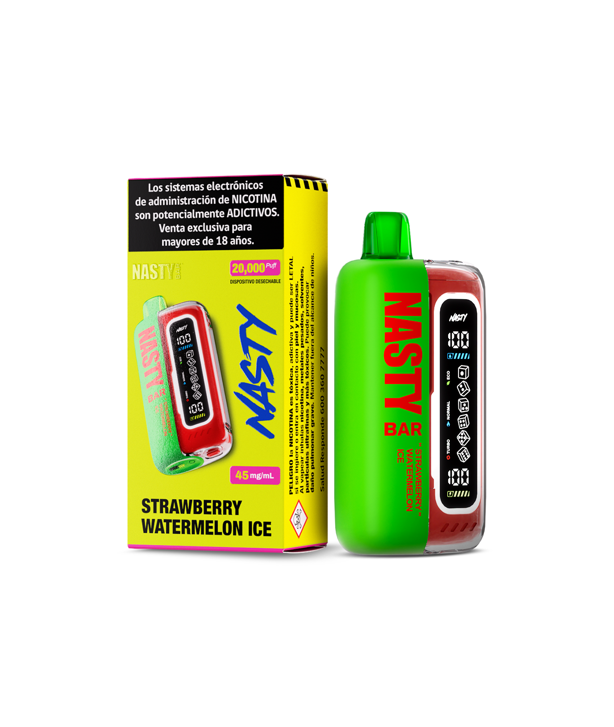 -El Nasty Bar 20K Strawberry Watermelon Ice 45mg combina dos frutas clásicas —fresa y sandía— en una mezcla jugosa, dulce y redonda, acompañada de un frescor helado que realza y equilibra el conjunto. El resultado es un perfil de sabor atractivo, limpio y perfecto para el uso diario o climas cálidos.