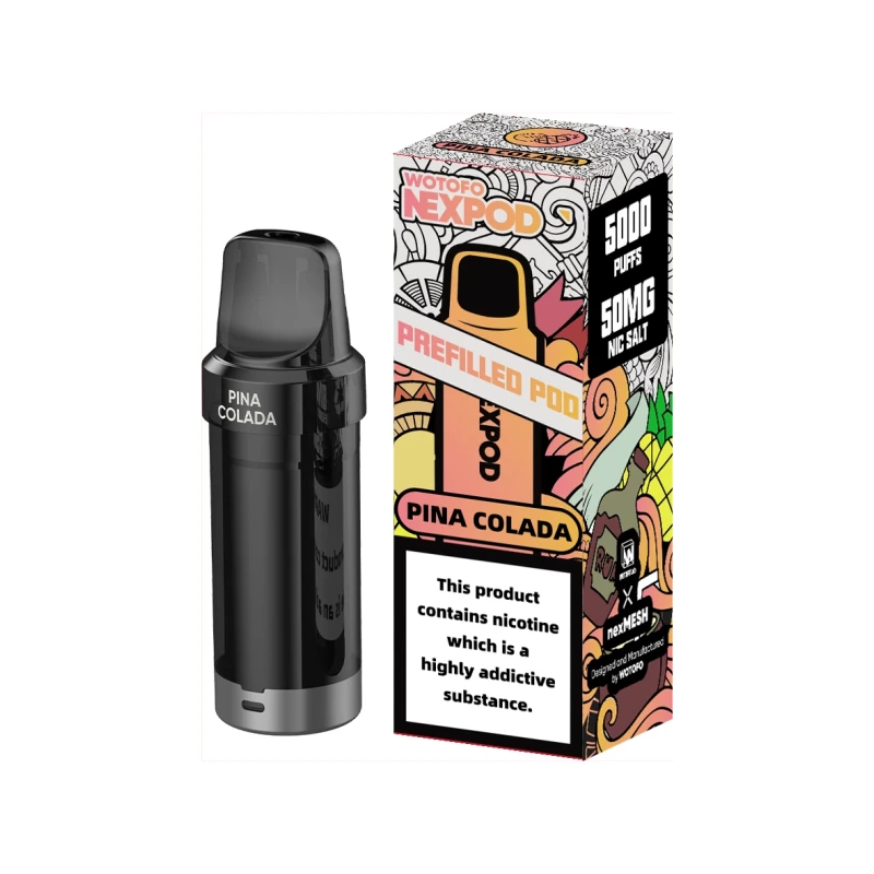 Pod prellenado con 5000 caladas y sabor tropical a piña colada. Alta concentración de nicotina (5%) y caladas suaves con golpe satisfactorio. Compatible con sistema NexPod de Wotofo.